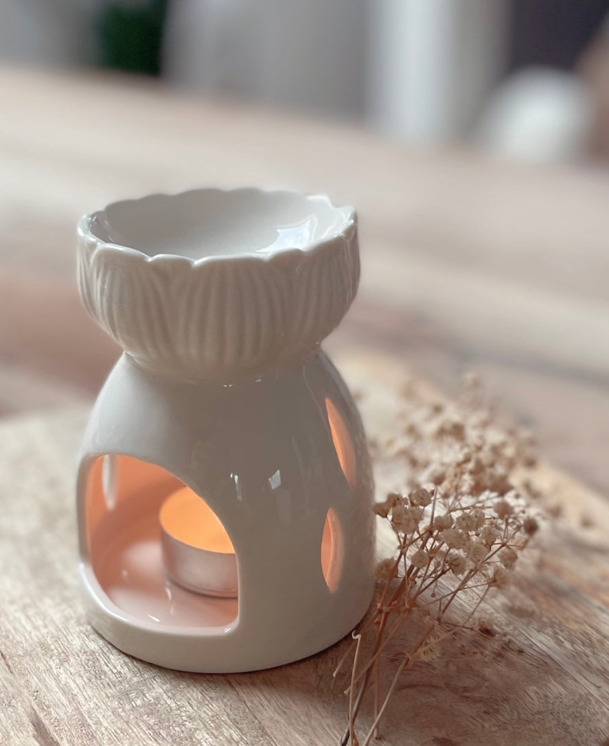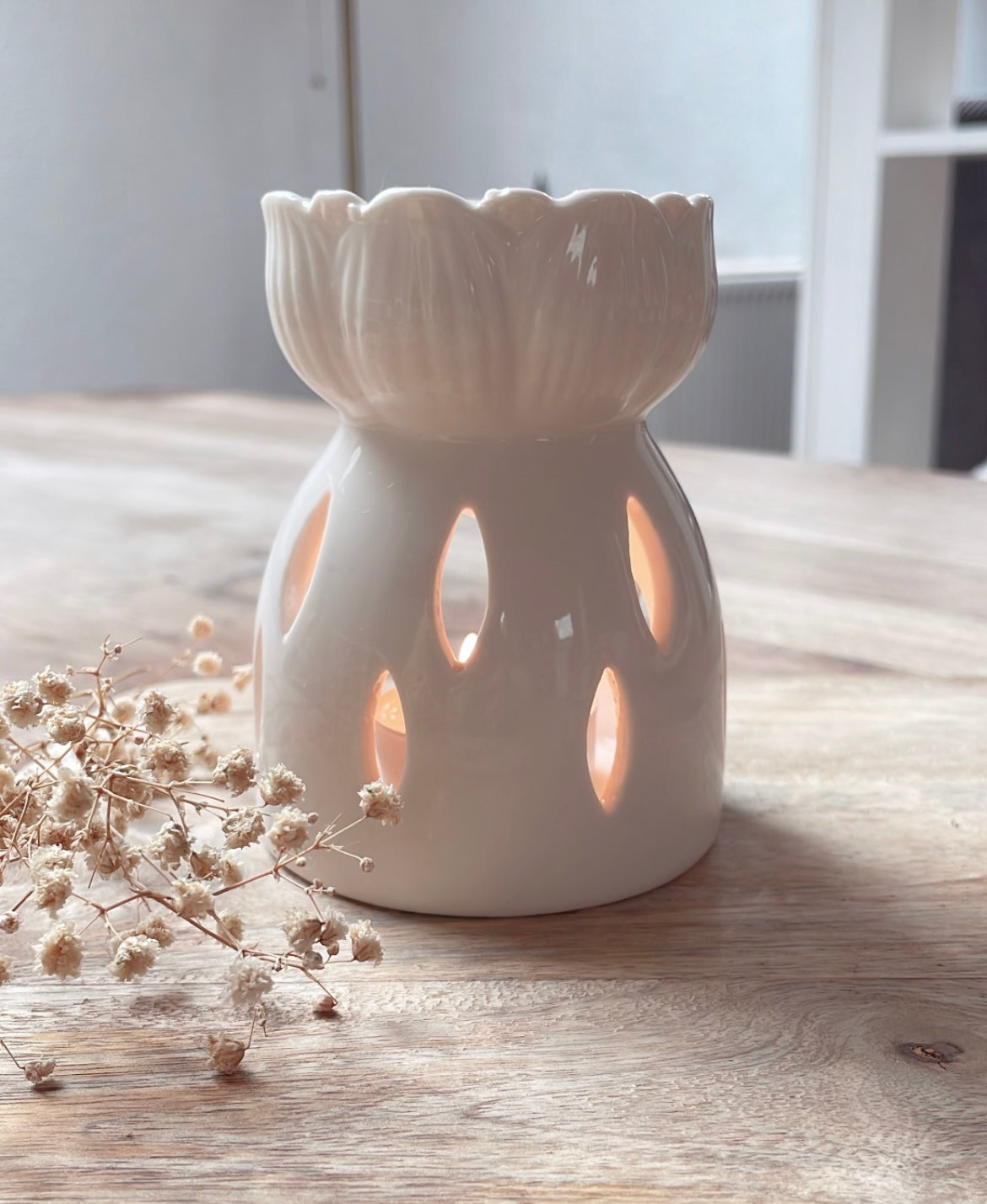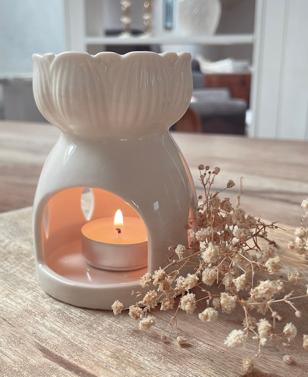 Die weiße Duftlampe ist aus Keramik gefertigt und glänzt in einer hübschen Blüten Optik. Kleine Ausschnitte sorgen für ein sanftes Durchschimmern des Lichts. Eher schlicht und klein gehalten passt sie zu jedem Stil und lässt sich unkompliziert dekorieren. Sie ist Teil der Autumn Days Kollektion und perfekt für gemütliche Abende und ein stimmungsvolles Licht.