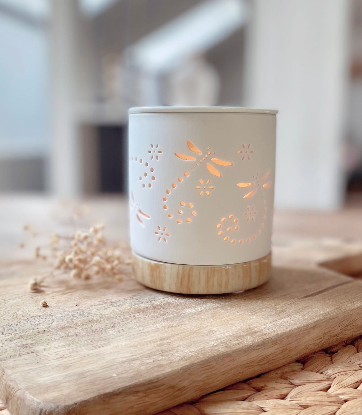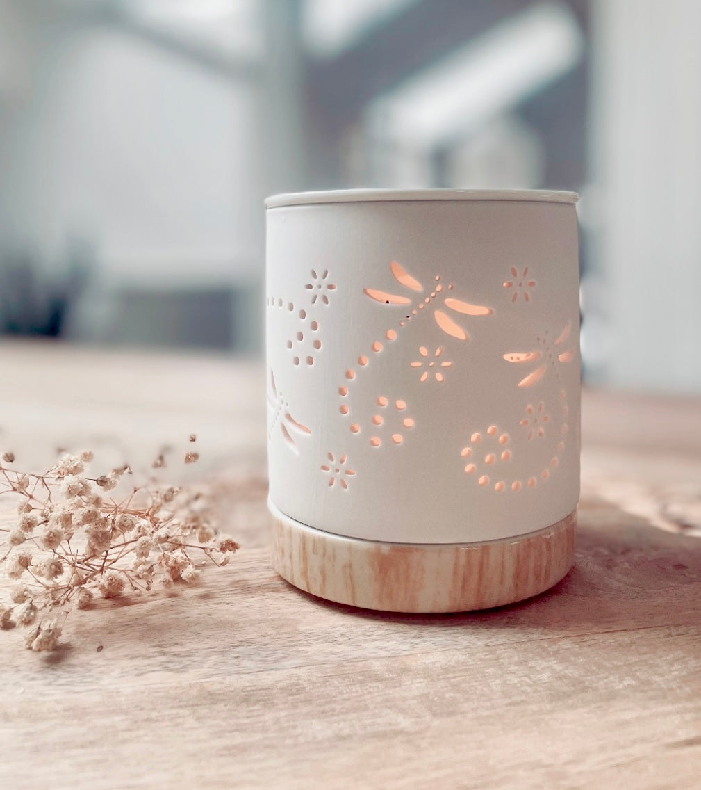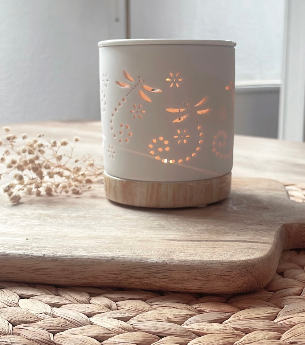 Diese Duftlampe ist aus Keramik gefertigt und erhält ihr hübsches Design durch ein Libellenmuster mit kleinen Blümchen. Die Kleinen Ausschnitte sorgen für ein sanftes Durchschimmern des Lichts. Ein tolles Detail ist der Keramiksockel mit Holzeffekt, er gibt der Duftlampe eine besondere Optik. Sie ist einfach perfekt für gemütliche Abende und ein stimmungsvolles Licht.