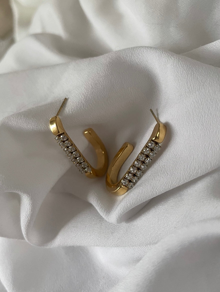 Ovale Zirkonia Ohrringe. Diese eleganten Ohrringe sind ein neues Schmuckstück aus der Classic Kollektion. Sie stehen für klassischen Chic und pure Eleganz. Sie halb offenen Creole sind aus glänzendem goldenen Edelstahl mit 14 kleinen Zirkonia Steinchen. Sie funkeln und glitzern wunderschön!